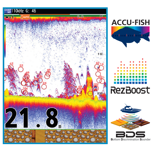 Furuno's ground-breaking REZBOOST™ signal processing technology enhances target separation and resolution when used with traditional CW narrow-band transducers. Locate individual game fish among bait balls and fish near the seafloor. With REZBOOST™, the ACCU-FISHTM feature will perform better and have greater resolution and clearer graphics.